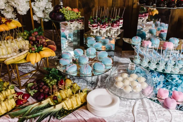- Кенді-бар на весілля – оформляється у кольорах події, призначений як для дітей, так і дорослих. Тістечка, цукерки та фрукти варто доповнити порційними міні-тортами, щоб гостям не довелося нудьгувати в очікуванні урочистого весільного торта.